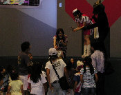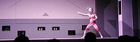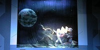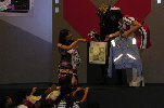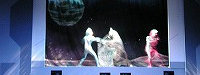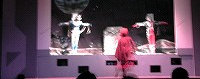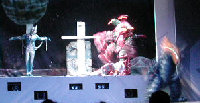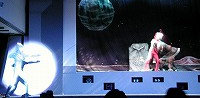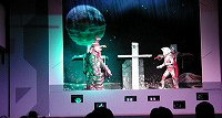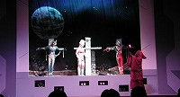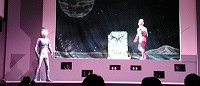 それではライブステージの始まり始まり〜♪ 今回はステージそのものが宇宙船という設定で みんなでウルトラ戦士に会いに行こうというお話し。 クルーは司会のお姉さんとミジー星人という設定ですが、 いきなり進入してきたダダのみなさんに運転士である ミジー星人は殺されてしまいます(泣)。合掌・・・。 |