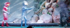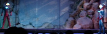 今回のストーリーを簡単に説明いたしますと 地球上のどこかにある怪獣動物園を制御する 自然コントロールマシンを マグマ星人によって制御不能になってしまった! なぜか司会のお姉さんを案内していたゼアス(笑) そしてレオ(今回の主役)、セブンの3人が マグマ星人の野望を阻止すべく奮闘する、 といったものです。 そのころもう一人の主役であるコスモスは 宇宙でジャスティスに破壊光線を食らってしまい 地上へ落下中。 |